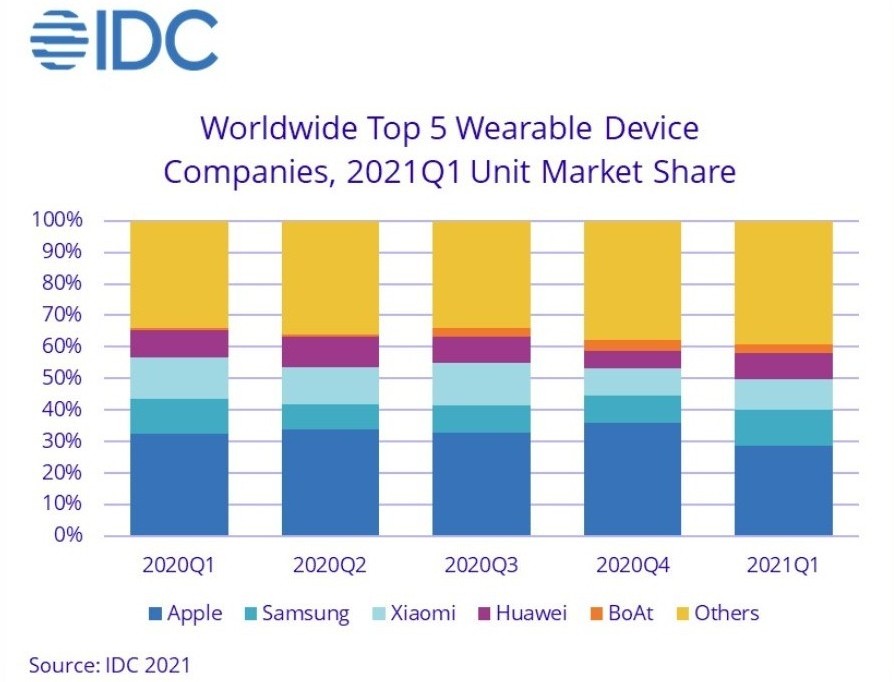 Obwohl Xiaomi in vielen Regionen und Ländern nach wie vor gehypt wird, verzeichnet Xiaomi als einziges Unternehmen in den Top 5 einen Absatzrückgang gegenüber dem Vorjahr. Die Kopfhörer und Smartwatches von Xiaomi verzeichneten ein starkes Wachstum im Vergleich zum Vorjahr, das Plus wurde allerdings durch einen starken Absatzrückgang bei den Xiaomi-Fitnessbändern, die mehr als die Hälfte des Gesamtvolumens im ersten Quartal 2021 ausmachten, aufgefressen. Huawei konnte sein Liefervolumen aus Q4/2020 übertreffen, in erster Linie dank einer hohen Nachfrage auf dem chinesischen Markt. Das indische Unternehmen BoAt bleibt weiter deutlich vor Fitbit sowie Huami und sichert sich damit Platz 5 im Ranking.