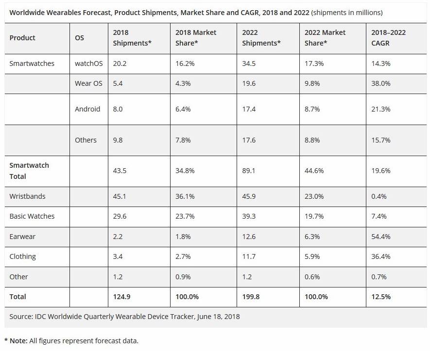 Obwohl das Wachstum im Marktsegment der Wearables im Jahr 2018 voraussichtlich leicht unter dem Wachstum von 10,3 Prozent des Jahres 2017 liegen wird, gehen die Marktforscher und Analysten von IDC davon aus, dass der Markt im Zeitraum von 2019 bis 2022 zweistellig wachsen wird. IDC sieht für Smartwatches und andere Formfaktoren wie Fitnessbänder, Earwear und Smart Clothing eine wieder deutlich zunehmende Popularität.