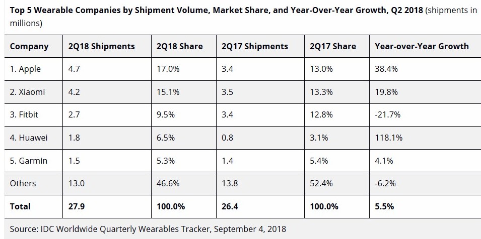 Apple behauptete seine Position bei den Wearables als Marktführer und bleibt weltweit mit der Apple Watch die Nummer 1. Platz 2 sichert sich Xiaomi aus China. Xiaomi hat es geschafft, sein Produktportfolio erfolgreich um smarte Schuhe, Kinderuhren und mehrere Varianten des Mi Fitnessbandes zu erweitern. Fitbit hat deutlich weniger Wearables abgesetzt. Mit der Smartwatch Versa hat der Fitnessgigant allerdings wieder Anschluss gefunden. Mit 1,1 Millionen Versa-Smartwatches in Q2 war Fitbit die zweitgrößte Smartwatch-Marke.