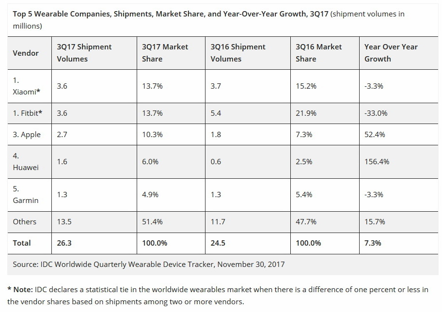 Für Branchenriesen wie Samsung und LG Electronics machen sich aber offenbar auch die langjährigen Beziehungen zu Telekommunikationsunternehmen nicht nachhaltig positiv in den Absatzzahlen für die Wearables der Südkoreaner bemerkbar. Nach wie dominieren hier andere Firmen, wie Fitbit und Xiaomi. Auch Apple kann den Absatz seiner Apple Watch im 3. Quartal 2017 deutlich steigern und bleibt damit der Konkurrenz von Huawei und Garmin einen Schritt voraus.