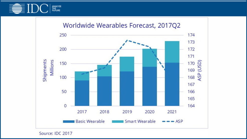IDC geht davon aus, dass in diesem Jahr weltweit insgesamt 121,7 Millionen Wearables ausgeliefert werden, was einen Anstieg um 16,6 Prozent gegenüber den im Jahr 2016 abgesetzten 104,4 Millionen Einheiten bedeutet. Der Gesamtmarkt für Wearables wird voraussichtlich dieses Wachstumspotenzial beibehalten und bis zum Jahr 2021 auf rund 229,5 Millionen wachsen. Das entspricht einer jährlichen Wachstumsrate (CAGR) von 17,2 %.