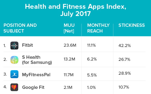 Neben Fitbit auf Platz 1 erzielen in den USA bisher nur Samsungs S Health (2) mit 13,2 Millionen und MyFitnessPal (3) mit 11,7 Millionen zweistellige monatliche Nutzerzahlen. Die übrigen Apps folgen dann mit einem deutlichem Abstand. Neben dem Spitzentrio weist der Verto Index folgende Apps in dieser Reihenfolge aus: Google Fit (2,1 Mio.), Walk with Map (2,0 Mio.), MyChart (1,9 Mio.), Garmin Connect Mobile (1,8 Mio.), Sleep Cycle Alarm Clock (1,7 Mio.), Weight Watchers (1,4 Mio.) und Period Tracker (1,4 Mio.).