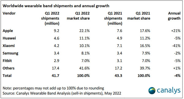 Der weltweite Gesamtmarkt für Wearables (Smartwatches und Fitnesstracker) war im ersten Quartal 2022 (Q1/2022) mit einem Minus von 4 Prozent und einem Absatzvolumen von insgesamt 41,7 Millionen Geräten leicht rückläufig. Während das Kaufinteresse der Konsumenten für smarte Armbanduhren, wie der Apple Watch, weiter deutlich ansteigt, lassen die Verbraucher im Gegenzug immer häufiger einfache Fitnessbänder wie Garmin Vivofit oder Fitbit Charge (bei Amazon für 139 Euro) links liegen.