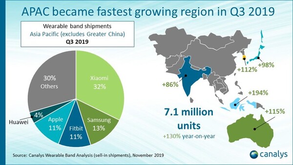 Xiaomi erreichte im Markt der Smartwatches und Fitnesstracker dank einer starken Performance in China und einer aggressiven Expansion in Übersee seinen bislang höchsten weltweiten Marktanteil von 27 %. Damit ist Xiaomi die Nummer 1 bei den Wearables, wenn es um das Segment smarter Geräte geht, die am Handgelenk getragen werden. Der Zweitplatzierte Apple verzeichnete das höchste YoY-Wachstum seit Q2/2017. Die Apple Watch Series 5 machte fast 60 % des gesamten Liefervolumens der Smartwatches von Apple aus.