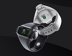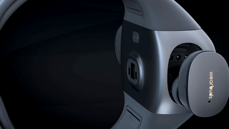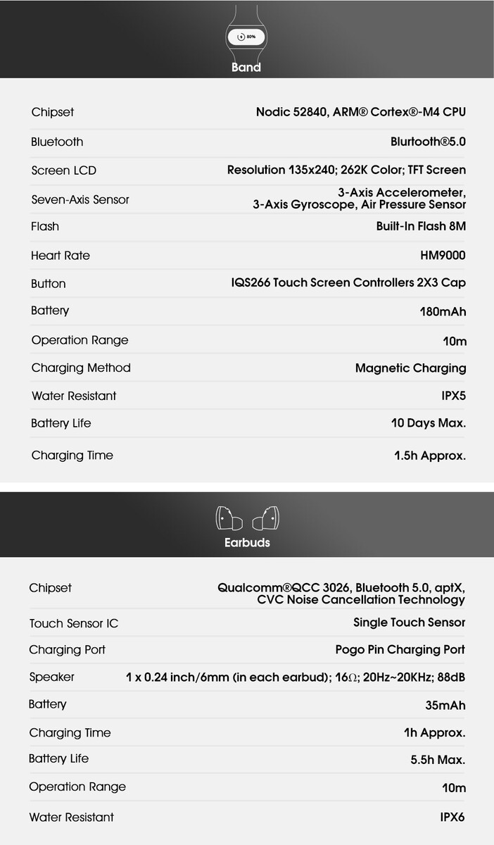 Dem Konzept sind die WearBuds treu geblieben. Ein extra Ladecase gibt es hier nicht, stattdessen laden die beiden Ohrhörer versteckt an den Seiten des Fitnesstrackers, den man um den Arm trägt und einen Herzfrequenzmesser mitbringt sowie die üblichen Aufgaben eines Fitness-Armbands inklusive Sleep-Tracking beherrscht, nicht allerdings die Blutsauerstoffmessung oder ein GPS-Modul. Sowohl Armband als auch das TWS-Headset sind natürlich wasserabweisend nach IPX5 beziehungsweise IPX6, die Ohrhörer bieten 5,5 Stunden Laufzeit am Stück, zwei weitere Ladungen, also 11 zusätzliche Stunden hält das Armband bereit.