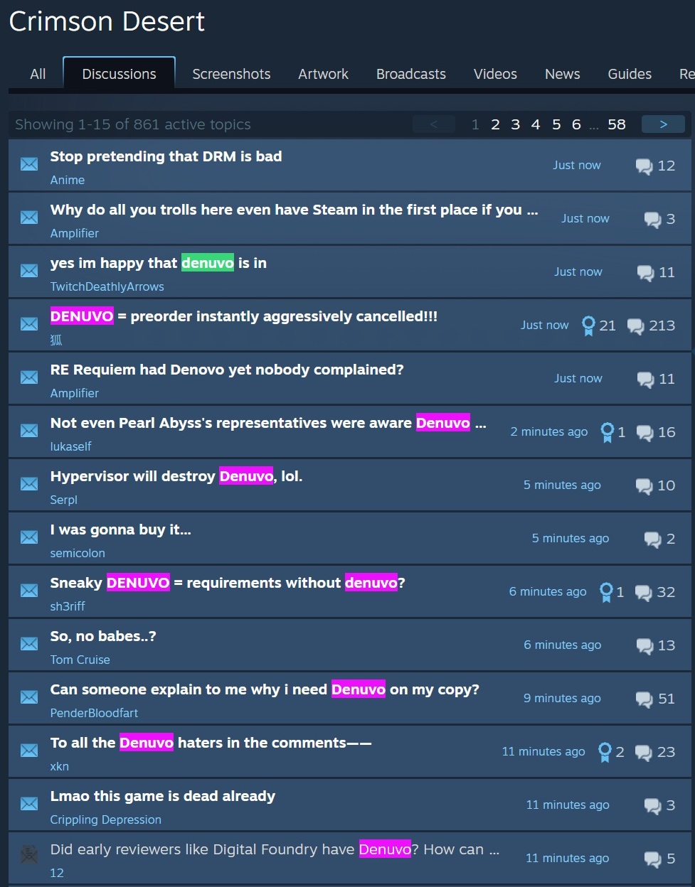 Unmittelbar nachdem sich die Nachricht verbreitet hatte, wurde das Steam-Forum des Spiels von genau dieser Beschwerde dominiert. Die meisten Spieler kritisieren, dass Denuvo erst so spät hinzugefügt wurde, nachdem sie sich bereits zum Kauf des Titels entschlossen hatten. Entsprechend drohen einige Käufer damit, ihre Vorbestellung von Crimson Desert zu stornieren – was Valve vor dem Launch auch gestattet.