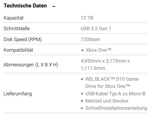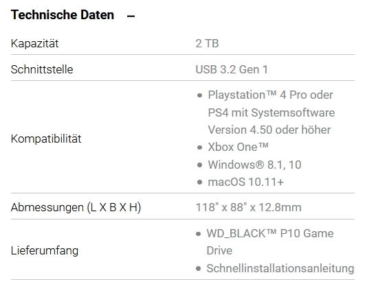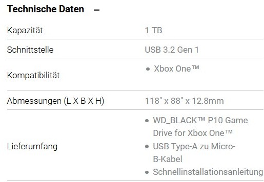 Hier die Produktdetails zur WD_Black D10, P10 (Xbox One) und P50 Game Drive Series (Herstellerangaben):