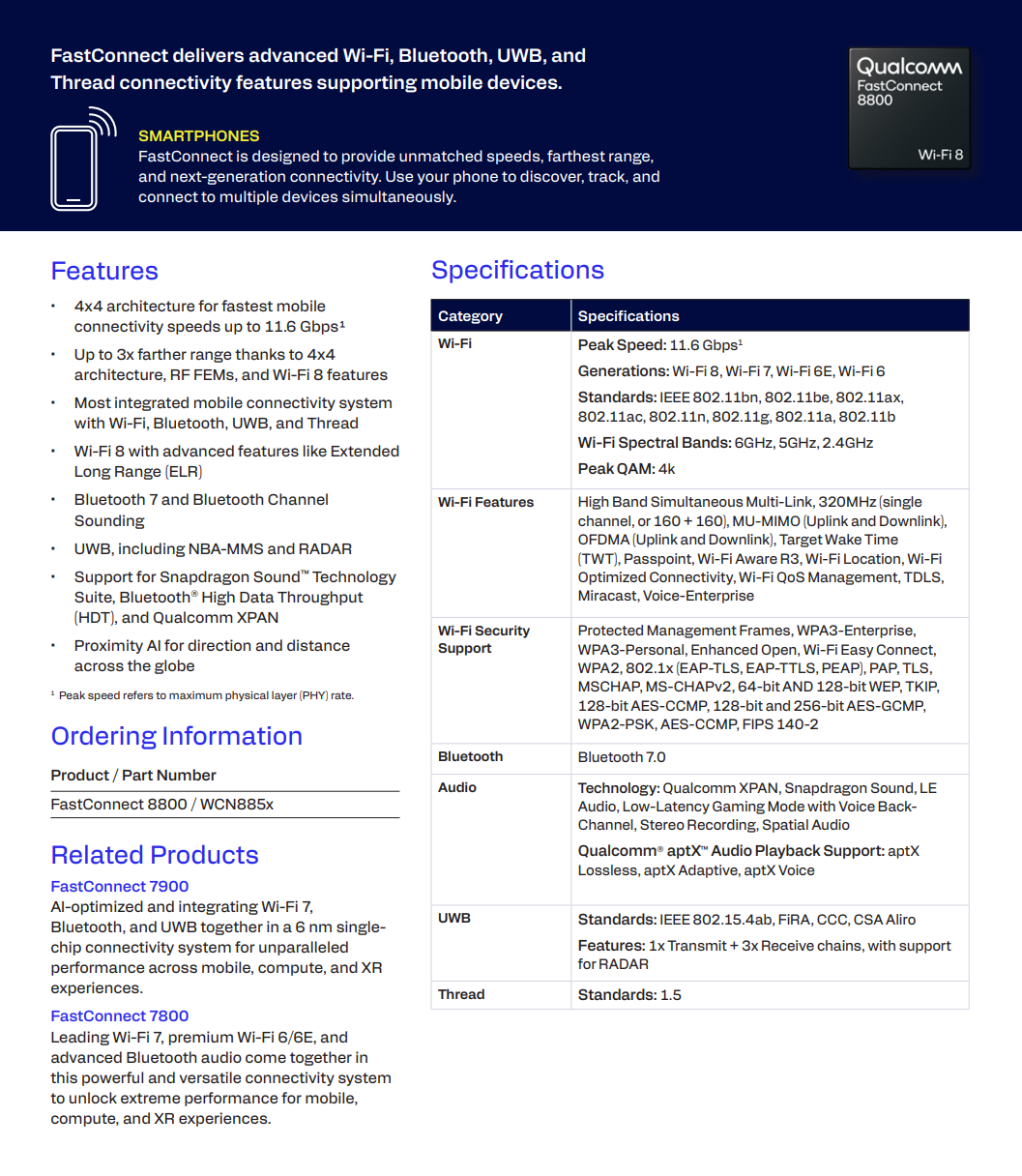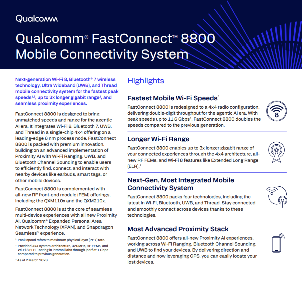 Qualcomm sieht Wi-Fi 8 als den Standard für die Agent AI Ära, der neue Chip unterstützt eine 4x4 Konfiguration, mit der die maximal mögliche Geschwindigkeit im Netz von bisher maximal 5,8 Gbps (FastConnect 7900, etwa im Snapdragon 8 Elite Gen 5) auf 11,6 Gbps verdoppelt. Auch Extended Long Range (ELR) wird unterstützt, die Gigabit-Reichweite soll sich nahezu verdreifachen. Wi-Fi 8 ist aber nicht die einzige Neuheit des Funkchips, der vermutlich im Snapdragon 8 Elite Gen 6 Pro zu finden sein wird, der im Herbst erwarteten Premium-Mobilplattform in 2nm-Fertigung.