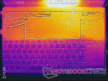 (+) Die maximale Temperatur auf der Oberseite ist 38.4 °C. Im Vergleich liegt der Klassendurchschnitt bei 36.9 °C (von 21.1 bis 71 °C für die Klasse Multimedia).