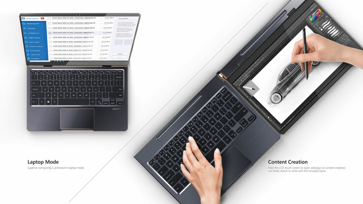 Damit erhält man auf der linken Seite die Tastatureinheit und rechts davon das 13,3 Zoll Touchdisplay, welches sich auf diese Art ideal für Grafiker und Designer eignen soll, denn es ließe sich bequem wie ein Wacom-Grafiktablet mit Stift nutzen. Zwischen den beiden "Scharnier-Modi" wird über einen kleinen Schalter gewechselt. Compal gibt 12 Monate als Entwicklungszeit an - mal sehen, ob dieses Design einmal verwirklicht wird.