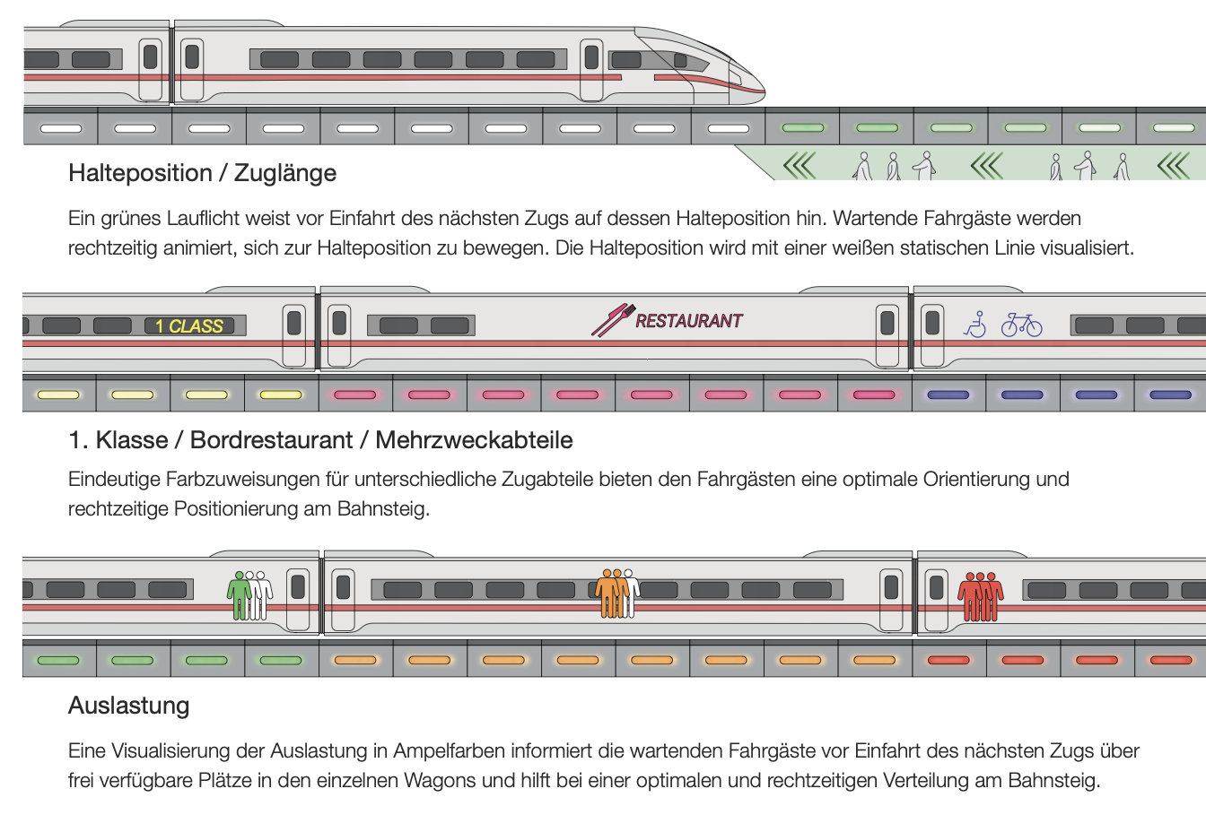 Auch ein Wagenstandsanzeiger ist denkbar, um etwa das Bordrestaurant oder die 1. Klasse am Boden zu markieren. Und natürlich sollen auch Einfahrten oder schnelle Durchfahrten besser markiert werden.