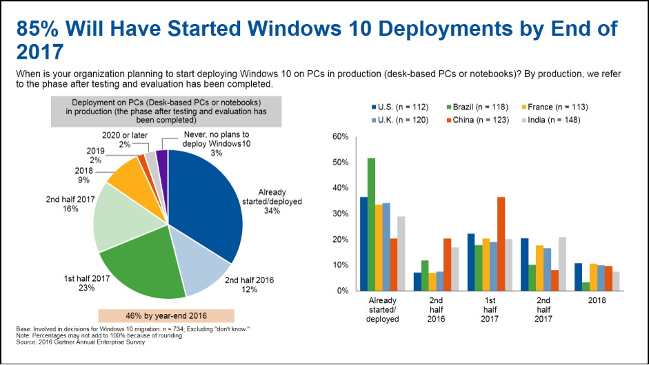 Demnach würden große Unternehmen entweder bereits den Umstieg auf Windows 10 planen oder diesen bis zum Jahr 2018 durchführen respektive abschließen. Dies zeige, dass eine Übergangsphase von älteren Softwareversionen auf Windows 10 existiert, beziehungsweise dass ältere Softwareversionen bereits ersetzt werden, bevor der Umstieg auf Windows 10 erfolge.