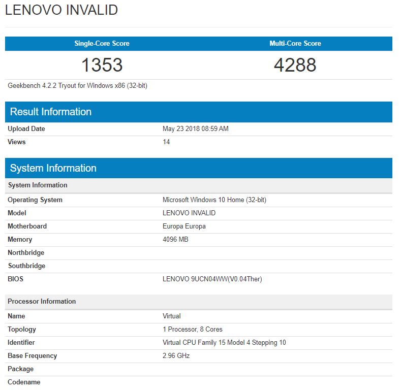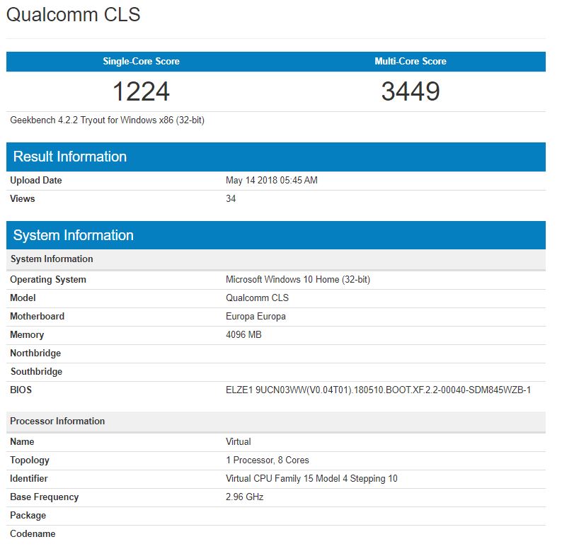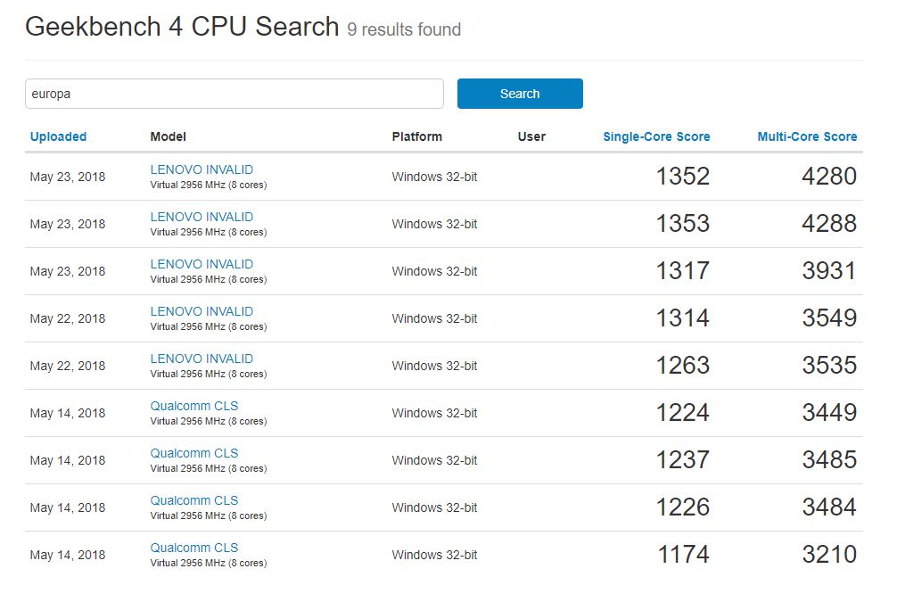 Unsere menschliche Suchmaschine Roland Quandt hat mal wieder zugeschlagen und zwei Geräte auf Geekbench gefunden, die offensichtlich bereits mit dem bis zu 3 Ghz schnellen Snapdragon 845 Octa-Core-SoC ausgestattet sind. Bei einem handelt es sich um eine Qualcomm-Testplattform, das andere ist ein noch namenloses Lenovo-Gerät mit dem Codenamen "Europa". Es bietet 4 GB RAM - weitere Ausstattungsdetails sind allerdings bis dato noch unbekannt. In wenigen Tagen startet die Computex 2018 in Taiwan - möglicherweise der Zeitpunkt für eine offizielle Präsentation von Qualcomm und Microsoft, beide sind jedenfalls auf der Messe zugegen.