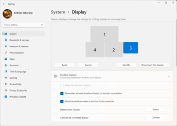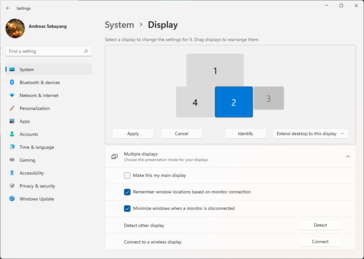Etwas angenehmer ist die Verwendung mehrerer, komplexer Monitor-Setups geworden. Die seltsamen Lücken bei der virtuellen Zuordnung, die es unter Windows 10 noch gab, sind verschwunden. Allerdings sind inaktive Monitore, etwa weil die Grafikeinheit nur eine begrenzte Menge gleichzeitig ansprechen kann, weiter schwer als solche erkennbar. Nervig: Wird ein Monitor aktiviert und ein anderer deaktiviert, wird die Zuordnung durcheinandergewürfelt.