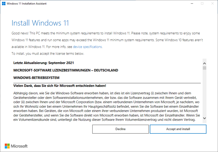 Hier gibt es dann ebenfalls noch einmal eine Warnung, die sich schließlich aber einfach wegklicken lässt. Dank heruntergeladenem Image war die Installation trotz der schwachen Hardware in grob zwei Stunden durchgeführt. Auffälligkeiten während der Installationsprozesses gab es nur an einer Stelle. Offenbar wurde gleich ein Update heruntergeladen, da die frische Installation sich mit der Buildnummer 22000.258 meldete.