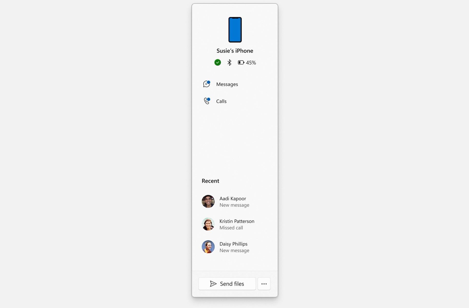 Ist das iPhone erstmal gekoppelt, zeigt das Startmenü die verbleibende Ladung des Akkus sowie die Signalstärke der Verbindung an. Es ist möglich, direkt vom Startmenü aus Anrufe zu starten oder Nachrichten an Kontakte zu schreiben. Neu ist die Möglichkeit, über einen Button direkt im Startmenü Dateien an ein iPhone oder ein Android-Smartphone zu schicken, die dann ähnlich wie bei Apple AirDrop drahtlos über WLAN übertragen werden.