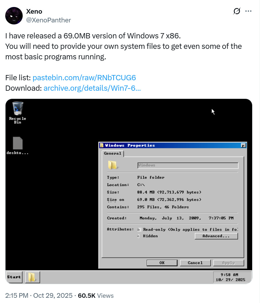 Ein Windows-Fan namens XenoPanther hat erfolgreich eine stark abgespeckte Version von Windows 7 entwickelt, die lediglich 69MB Speicherplatz benötigt. Das Projekt wurde am 29. Oktober online veröffentlicht und zeigt, wie weit sich das Microsoft-Betriebssystem verkleinern und danach trotzdem noch booten lässt.