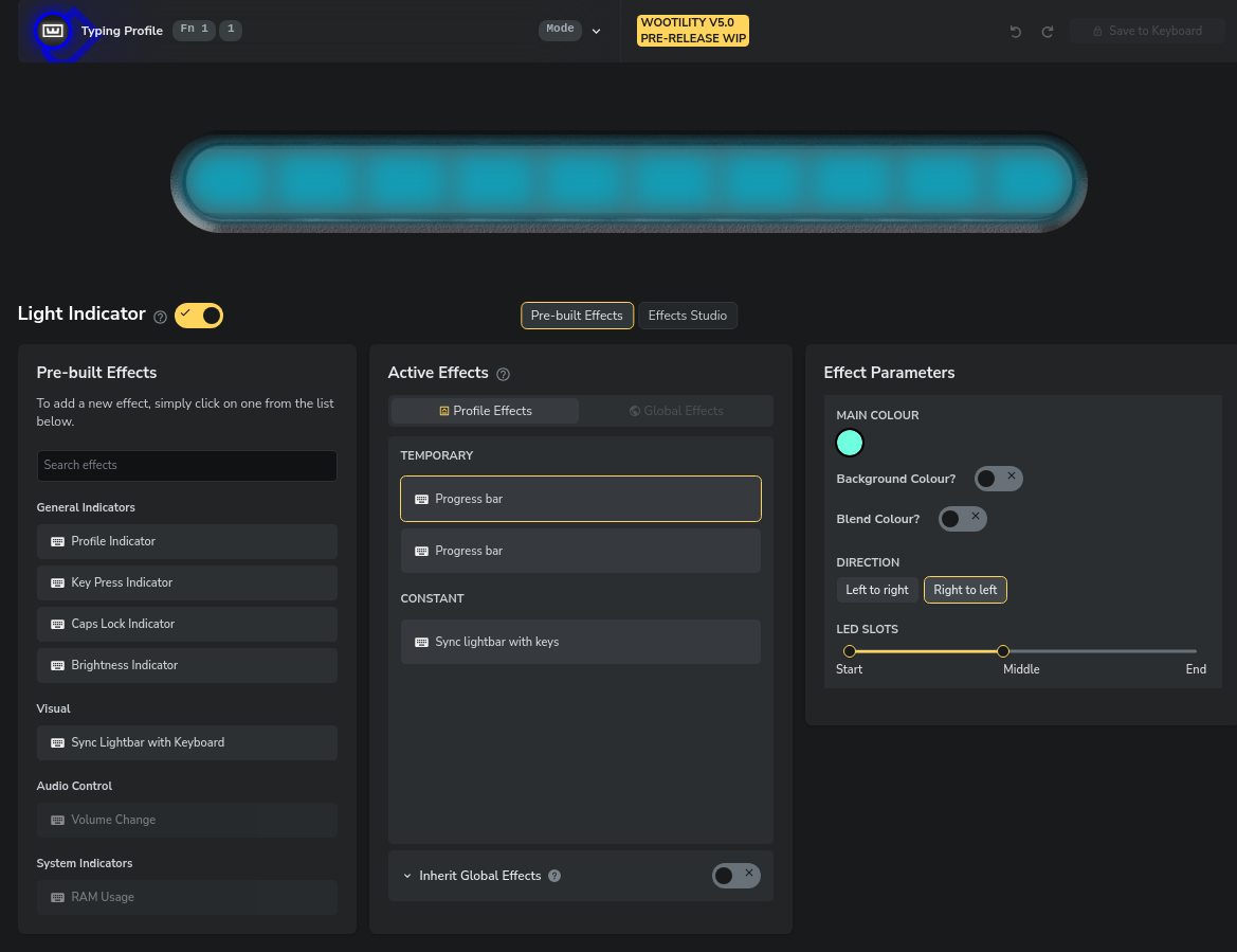 Eines der einzigartigen Merkmale des Wooting 80HE ist die LED-Leiste – Wooting nennt sie in der Wootility Web-App „LED-Anzeige“. Sie kann verwendet werden, um verschiedene Effekte anzuzeigen, wobei die meisten davon eher spielerischer Natur sind. Sie können die LED-Leiste des Wooting 80HE als Tastendruck-Wegmesser und Rapid-Trigger-Anzeige verwenden, was eine nützliche Möglichkeit sein könnte, sich mit diesen Funktionen vertraut zu machen. Die bei weitem nützlichsten Funktionen der LED-Anzeige sind jedoch die Anzeige der Systemlautstärke und der RAM-Nutzung. Für beide Funktionen müssen jedoch Hintergrundprogramme auf dem System laufen, die Wooting bislang nicht freigegeben hat.