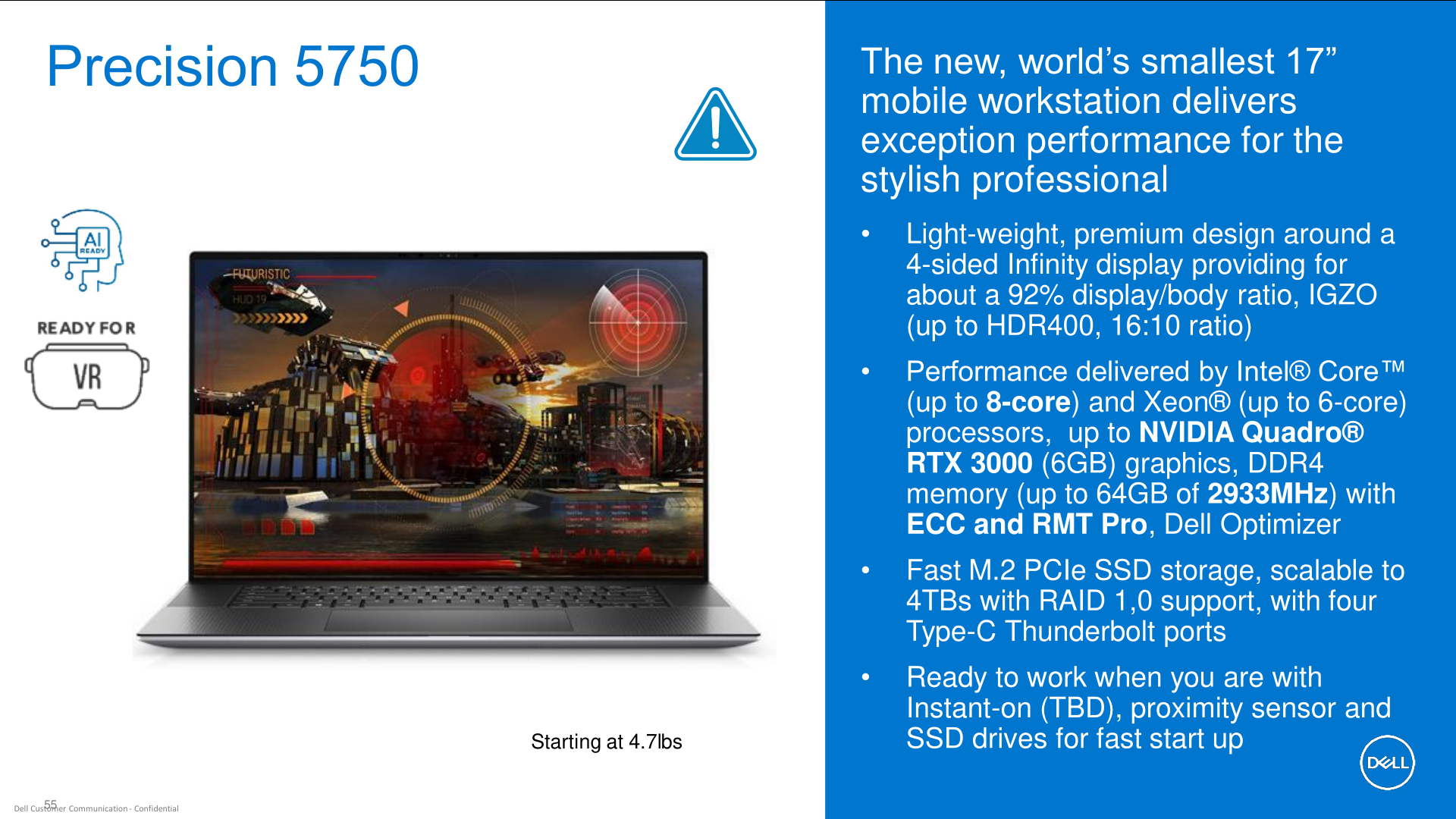 Apropos Display: Der zweite Vorteil ist, dass Dell beim Precision 5750 einen Bildschirm im 16:10-Format verwenden wird. Damit bietet es vertikal mehr Arbeitsfläche als eine Workstation mit 17,3-Zoll-16:9-Bildschirm wie das deutlich dickere Dell Precision 7740. Der Bildschirm wird auf der IGZO-Technologie basieren und auch den HDR400-Standard unterstützen – konkrete Angaben zu Helligkeit und Farbraumabdeckung liefert die geleakte Folie aber leider nicht.