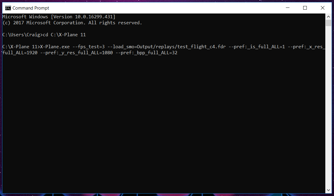 - X-Plane 11 med 1080p - X-Plane.exe --fps_test=2 --load_smo=Output/replays/test_flight_c4.fdr --pref:_is_full_ALL=1 --pref:_x_res_full_ALL=1920 --pref:_y_res_full_ALL=1080 --pref:_bpp_full_ALL=32