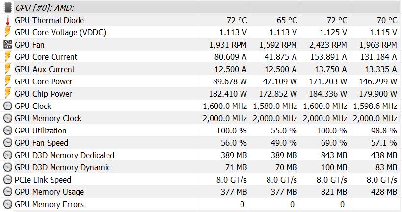 Im Leerlauf taktet die GPU mit 300 MHz und verbraucht im Mittel nur 6 bis 8 Watt. Beim Stresstest gibt HWiNFO bei der GPU einen Energiebedarf von maximal 184 Watt an. Damit liegt der Verbrauch der XFX Radeon RX 590 Fatboy OC+ schon etwas über den Referenzangaben, was aber auf den höheren GPU-Takt zurückzuführen ist. Versuchen wir aus der Grafikkarte noch mehr Leistung herauszuholen, müssen wir das Power-Target erhöhen, was jedoch dazu führt, dass die Kühleinheit sehr schnell mit der entstehenden Abwärme überfordert ist. Außerdem ließ sich die RX 590 von XFX nur um weitere 20 MHz übertakten. Beim VRAM konnten wir ein Plus von 200 MHz erzielen. Insgesamt konnte dieser Leistungszuwachs jedoch nicht in bessere Ergebnisse bei den synthetischen Benchmarks umgesetzt werden. Mit 225 Watt verbrauchte die GPU mit unseren manuellen OC-Einstellungen nochmals deutlich mehr. Wer hier noch mehr aus dem Grafikchip quetschen möchte, kommt um eine Flüssigkeitskühlung nicht herum. Das Übertakten unseres Testmodells lohnt sich mit dem Standardkühler der XFX Radeon RX 590 Fatboy OC+ nicht.