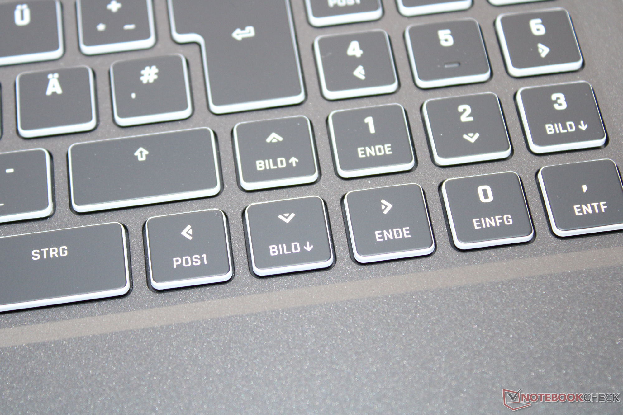 Das Apex hat eine beleuchtete Chiclet-Tastatur (RGB) samt Nummernblock an Bord. Sie verfügt über ebene, glatte Tasten, die einen mittleren Hub und einen klaren Druckpunkt bieten. Der Tastenwiderstand geht in Ordnung. Während des Tippens wippt die rechte Hälfte der Tastatur etwas. Als störend hat es sich nicht erwiesen. Alles in allem ist hier eine alltagstaugliche Tastatur zu bekommen.