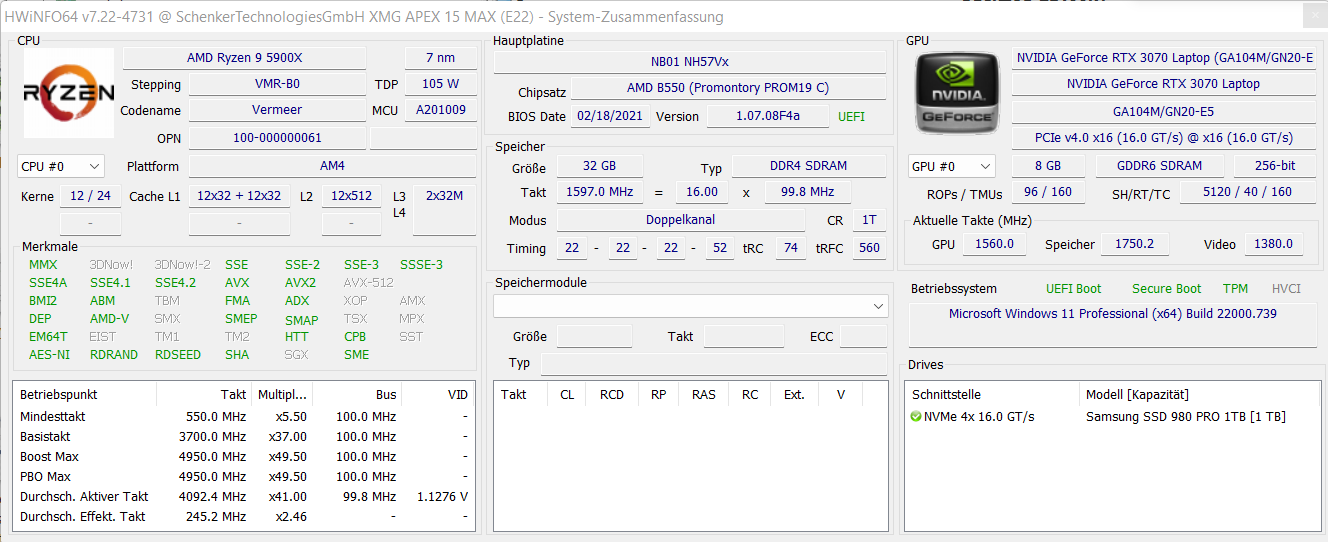 | Schenker XMG Apex 15 Max R9 5900X, GeForce RTX 3070 Laptop GPU | Eurocom Nightsky ARX315 R9 5900X, GeForce RTX 3070 Laptop GPU | MSI Vector GP66 12UGS i9-12900H, GeForce RTX 3070 Ti Laptop GPU | HP Omen 16-b1090ng i7-12700H, GeForce RTX 3070 Ti Laptop GPU | Schenker XMG Apex 15 NH57AF1 R9 3900, GeForce RTX 2070 Mobile | Gigabyte A5 X1 R9 5900HX, GeForce RTX 3070 Laptop GPU | Durchschnitt der Klasse Gaming | |