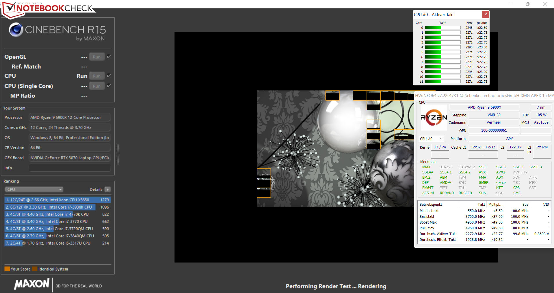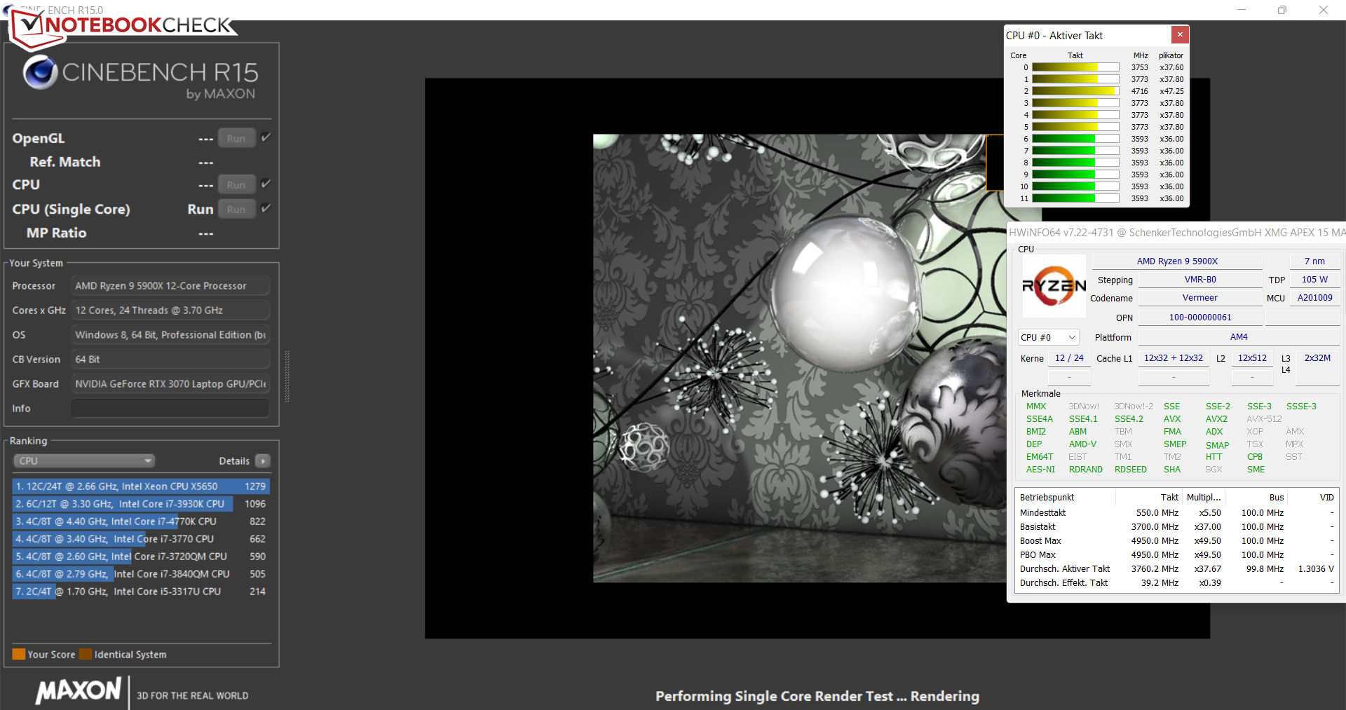 Auffällig: Das Apex schneidet im Multi-Thread-Betrieb bei gleicher Leistungseinstellung (Leistungsmodus, max. Lüfter) klar besser ab als das baugleiche, ebenfalls mit einer Ryzen-9-5900X-CPU bestückte Eurocom Nightsky ARX315. Vermutlich kitzelt das optimierte, Schenker-eigene BIOS mehr Leistung aus der CPU.