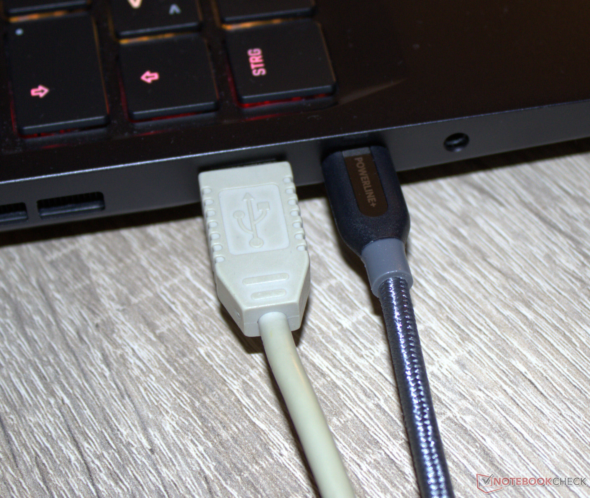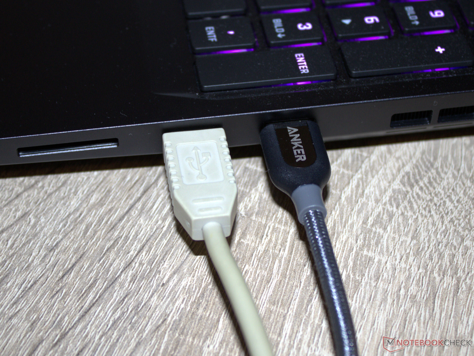 Der Abstand zwischen den USB-Ports (rechte Seite: 12 mm, linke Seite: 8 mm) dürfte ausreichend bemessen sein: Zwei Sticks bzw. Stecker gängiger Breiten können gleichzeitig eingesteckt sein (siehe Bilder in der Galerie). Videoausgänge und Strombuchse befinden sich auf der Rückseite des Geräts. Zugehörige Kabel würden nach hinten laufen und nicht im Weg liegen.