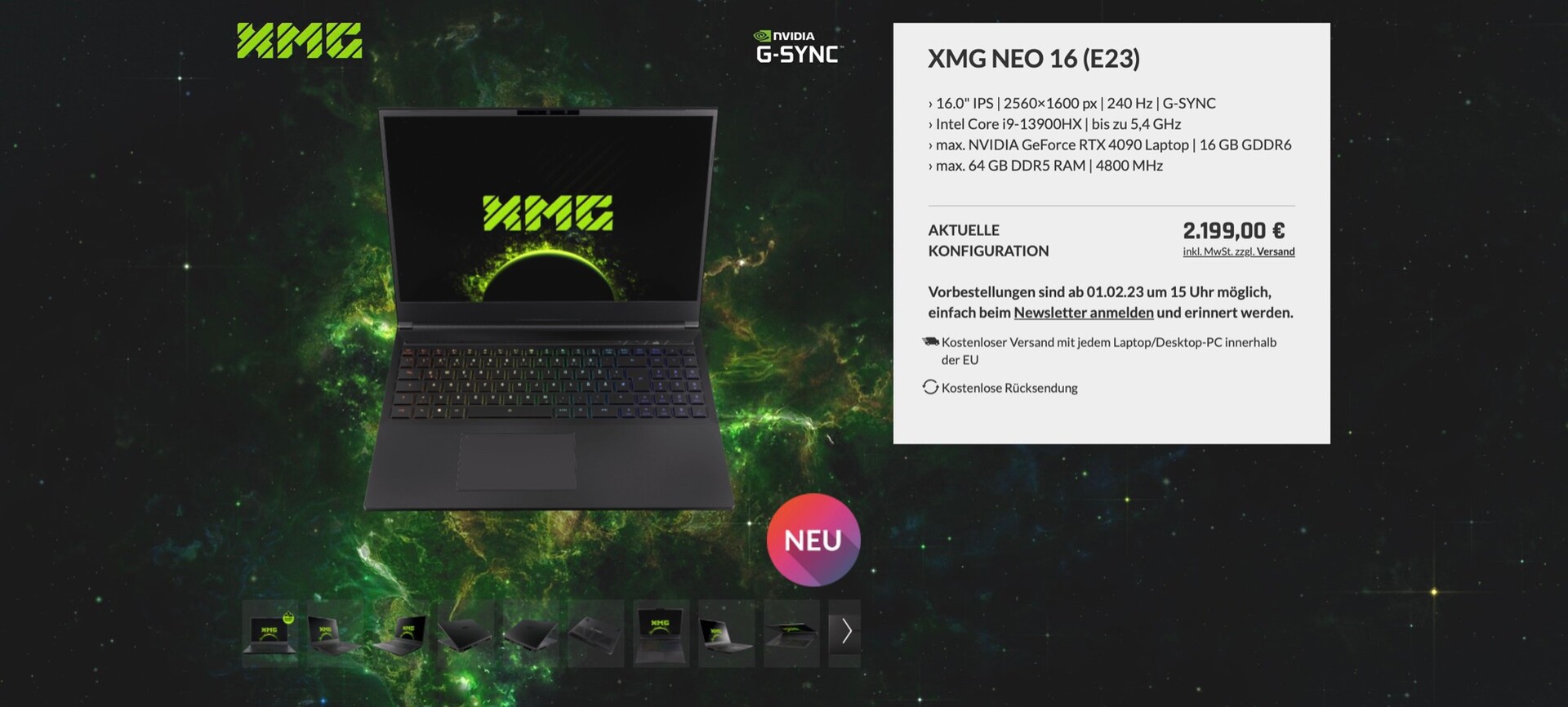 Das XMG Neo 16 (E23) und das XMG Neo 17 (E23) können ab sofort über Bestware vorbestellt werden. Das Neo 17 wird ab 8. Februar ausgeliefert, das Neo 16 folgt etwas später. Das Basismodell des Neo 16 wird für 2.199 Euro angeboten.