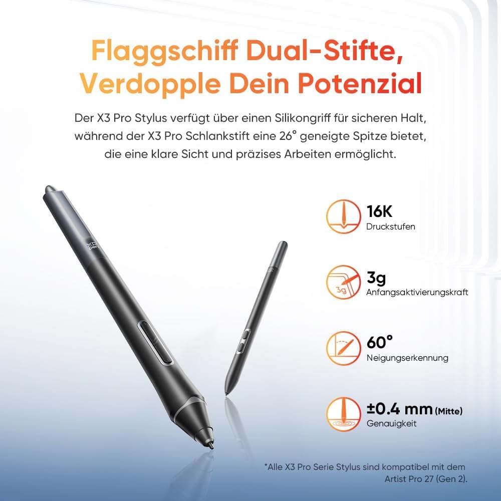 Im Lieferumfang ist der X3 Pro-Stylus enthalten. Dieser kann zwischen über 16.000 Druckstufen differenzieren. Die Genauigkeit beziehungsweise dann eher die Abweichung wird in der Mitte des Displays auf maximal 0,4 Millimeter spezifiziert. Eine Neigungserkennung ist integriert, der X3 Pro-Stylus bringt auch Tasten mit. Ebenfalls im Lieferumfang ist ein Bedienpanel enthalten. Mit diesem dürften sich häufig genutzte Werkzeuge schnell auswählen lassen. Touch-Gesten werden sowohl unter Windows als auch macOS unterstützt. Die Anbindung ist etwa über USB Typ C oder HDMI möglich, ein Kopfhöreranschluss steht bereit.