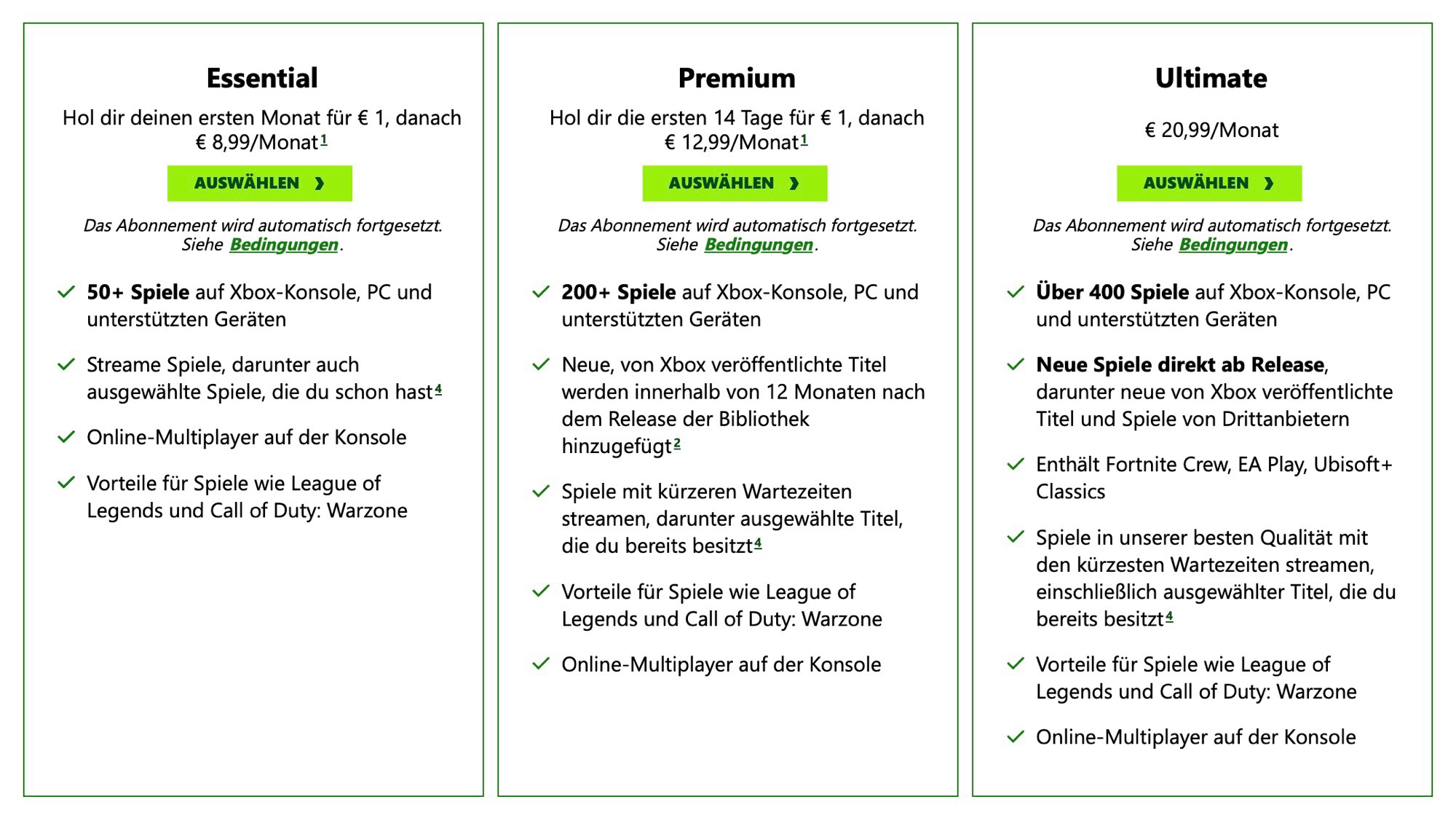 Die Abonnements bleiben ansonsten unverändert. Der Xbox Game Pass Ultimate umfasst weiterhin den Zugriff auf mehr als 400 Spiele, sowohl für die Xbox Series X (ca. 599 Euro auf Amazon) als auch für den PC. Die meisten von Microsoft veröffentlichten Spiele sind direkt ab Release im Abo verfügbar, und auch die Abos für Fortnite Crew, EA Play und Ubisoft+ Classics sind enthalten. Spiele können sowohl heruntergeladen als auch gestreamt werden. Der PC Game Pass verzichtet auf Spiele-Streaming und Xbox-Titel, bietet aber Zugriff auf Hunderte PC-Spiele inklusive neuer Microsoft-Titel sowie auf EA Play.