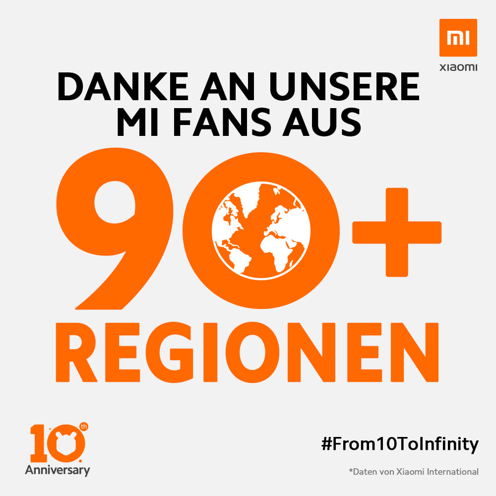"Danke an unsere Mi Fans aus 90+ Regionen" ist auf dem Teaser zum Xiaomi 10. Anniversary zu lesen und das deutsche Facebook-Community-Team ergänzt das bildliche "Danke schön" mit einer passenden Dankesbotschaft: "Über 90 Regionen in 10 Jahren. Wir sind alle eine große Mi Familie... #From10ToInfinity".