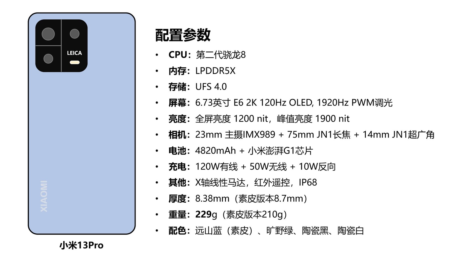 Als weitere Features nennt der Leak unter anderem einen 5G, IR-Blaster, NFC und die bereits bestätigte IP68-Zertifzierung. Verpackt ist das alles beim Xiaomi 13 in einem 7,98 mm (Lederversion 8,1 mm) dünnen und 189 g (Leder 185 g) leichten Gerät. Das Xiaomi 13 Pro fällt mit 229 g (Leder 210 g) und 8,38 mm (Leder 8,7 mm) etwas schwerer und dicker aus. Als Farben werden Distant Mountain Blue (Leader), Wilderness Green, Ceramic Black und Ceramic White genannt.