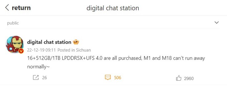 Aber auch in anderen Bereichen wird Xiaomi mehr Ultra bieten, verspricht der gewöhnlich gut informierte chinesische Leaker Digital Chat Station. Seinen Hinweisen zufolge wird das mit Codenamen "M1" versehene Xiaomi 13 Ultra auch eine Konfiguration mit 16 GB LPDDR5X RAM und bis zu 1 TB UFS 4.0 Speicher haben, zumindest mal für China. Es ist ohnehin verwunderlich, dass die ansonsten oft so speicherhungrigen Chinesen bis dato kaum Alternativen zu Samsungs Speichermonstern anzubieten hatten, auch diesbezüglich dürfte 2023 aber Neues bringen. In seinem Weibo-Post erwähnt der Leaker übrigens auch ein Xiaomi-Phone mit Code M18, hierbei dürfte es sich um das Ende 2023 erwartete Xiaomi Mix Fold 3 handeln, das gerüchteweise erstmals auch global an den Start gehen könnte.