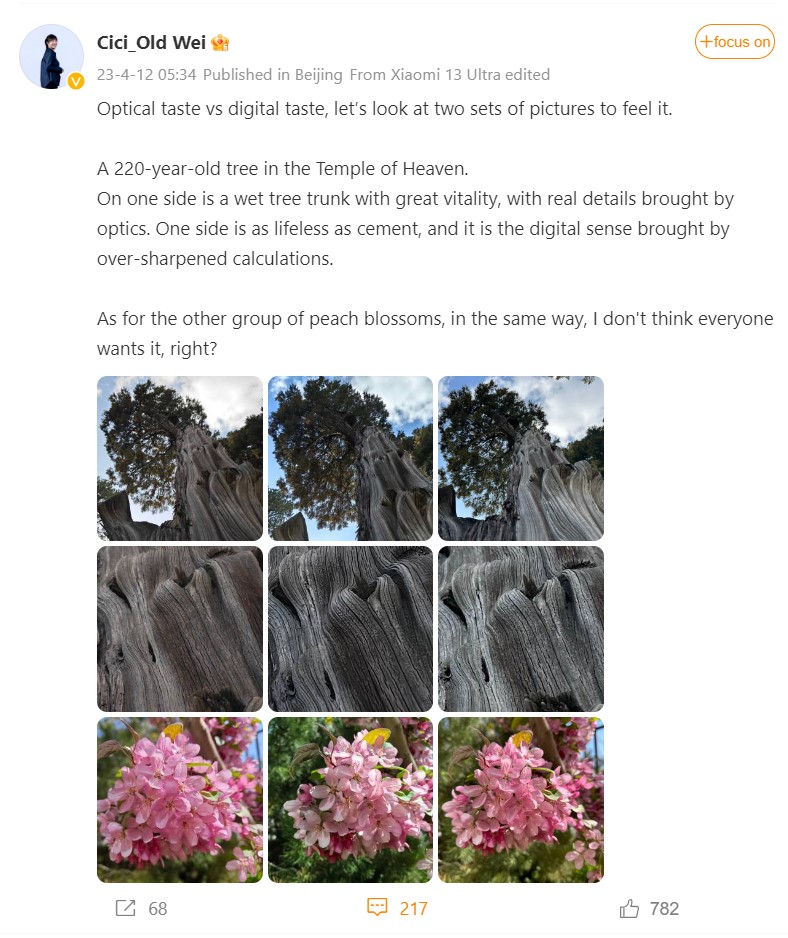 In dem Set aus jeweils drei Photos stammt das erste immer aus der Kamera des Xiaomi 13 Ultra und soll insbesondere durch seine natürlicheren Farben (brauner Stamm vs. grauer Stamm) und die sanfteren Strukturen ohne künstlicher Überschärfung überzeugen. In einem ausführlichen Weibo-Post ging Xiaomi bereits auf die optische Güte der neuen Summicron-Optik ein, die das digitale Nachschärfen der Photos überflüssige mache - so Xiaomi. Wer also den "digitalen Look" vieler aktueller Smartphone-Kameras nicht mag, wird mit der neuen Leica-Optik vielleicht glücklicher werden. Ob das Xiaomi 13 Ultra hält, was Xiaomi vorab verspricht, werden natürlich erst die Tests nach dem Launch zeigen, zudem dürfte sich der Hersteller die hohe Kamera-Qualität auch fürstlich bezahlen lassen, insbesondere in Europa.