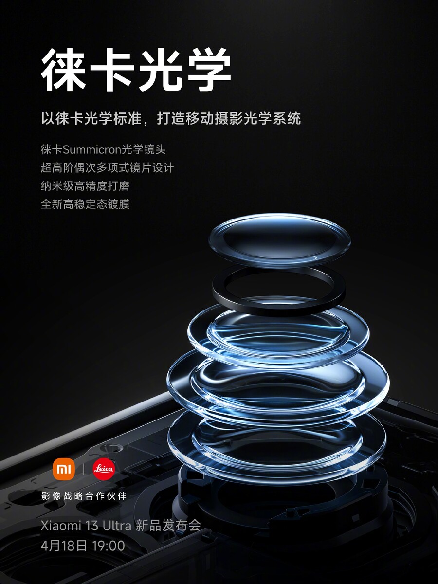 Ein weiteres Teaserplakat bewirbt die qualitativ hochwertige Optik im Xiaomi 13 Ultra. Demnach wurde die Summicron-Optik mit höchster Präzision nach Leica-Standards produziert. In der Herstellung wurden Präzisionsinstrumente in 20 Nanometer-Größe genutzt, ist hier auf Weibo zu lesen. Laut Xiaomi erreichen nur etwa 10 Prozent der produzierten Linsen die erforderlichen Standards, um im Xiaomi 13 Ultra verbaut zu werden. Die Beschichtung soll in heißen und kalten Umgebungen hervorragende Bilder liefern und sei so gut, dass man größtenteils auf künstliches Nachschärfen der Aufnahmen verzichten könne.