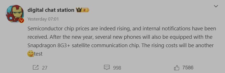 Weiterführende Gerüchte zu diesem potentiellen Neuzugang findet ihr übrigens hier. Mittelfristig dürften steigende Chip-Preise von Qualcomm und Co. allerdings nicht gerade zu einer Entspannung an der Preisfront beitragen. Der US-Amerikanische Marktführer äußert sich zwar nicht offiziell zu den Verkaufspreisen für seine beliebten Snapdragon Mobilplattformen, doch laut Insider steigen die Kosten für Qualcomms Partner stetig. Bereits im Vorjahr äußerte sich Digital Chat Station zu den gestiegenen Kosten des Snapdragon 8 Gen 3 im Vergleich zum Snapdragon 8 Gen 2, der - ebenfalls gerüchteweise - um etwa 160 US-Dollar das Stück abgegeben wurde. Nun postete der Leaker erneut zum Thema (siehe auch Screenshots unten). Demnach sei auch deswegen mit weiter steigenden Preisen zu rechnen, weil Smartphones in diesem Jahr vermehrt auf zusätzliche Chips für Satelliten-Funktionen setzen.
