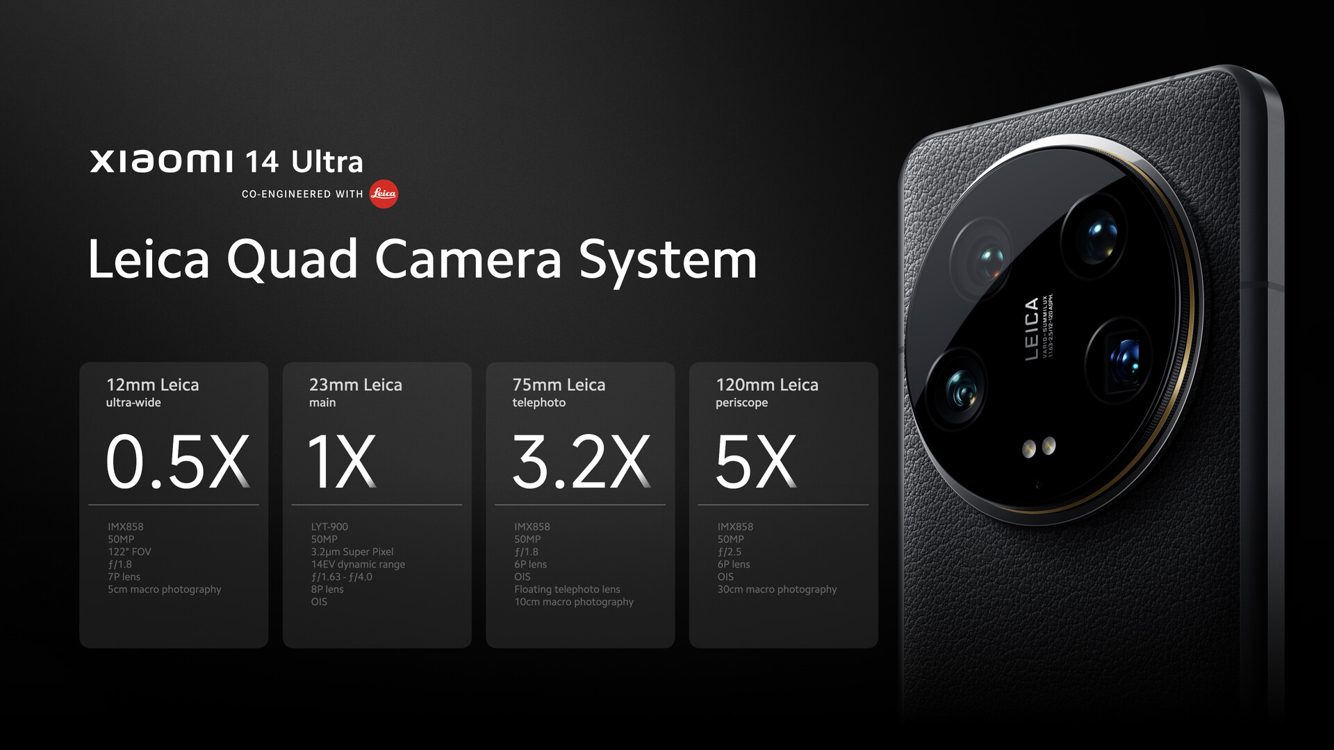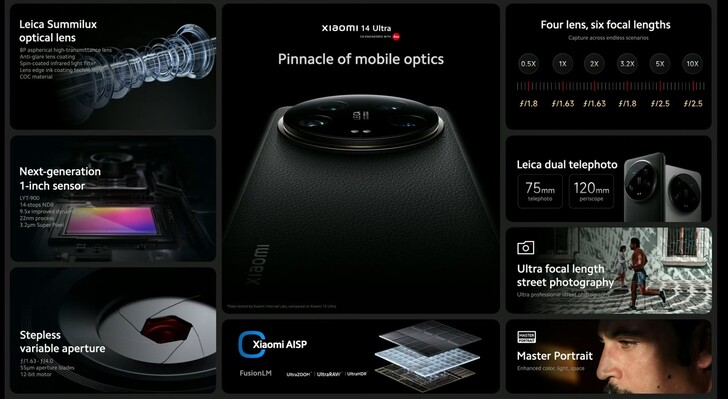 Das 12mm Ultraweitwinkel mit F/1.8 Blende kann bis zu 5 cm an ein Objekt heranrücken, das 75mm äquivalente Telefoto mit F/1.8 Blende auf 10 cm und das 120 mm Periskop-Telefoto mit F/2.5 Blende auf immerhin noch 30 cm. Im Vergleich zum Vorgänger bewirbt Xiaomi die deutlich lichtstärkeren Linsen, zudem beherrscht das Xiaomi 14 Ultra 8K30 Video mit allen vier 50 Megapixel-Kameras, 4K120 Zeitlupe aber nur mit der Hauptkamera.