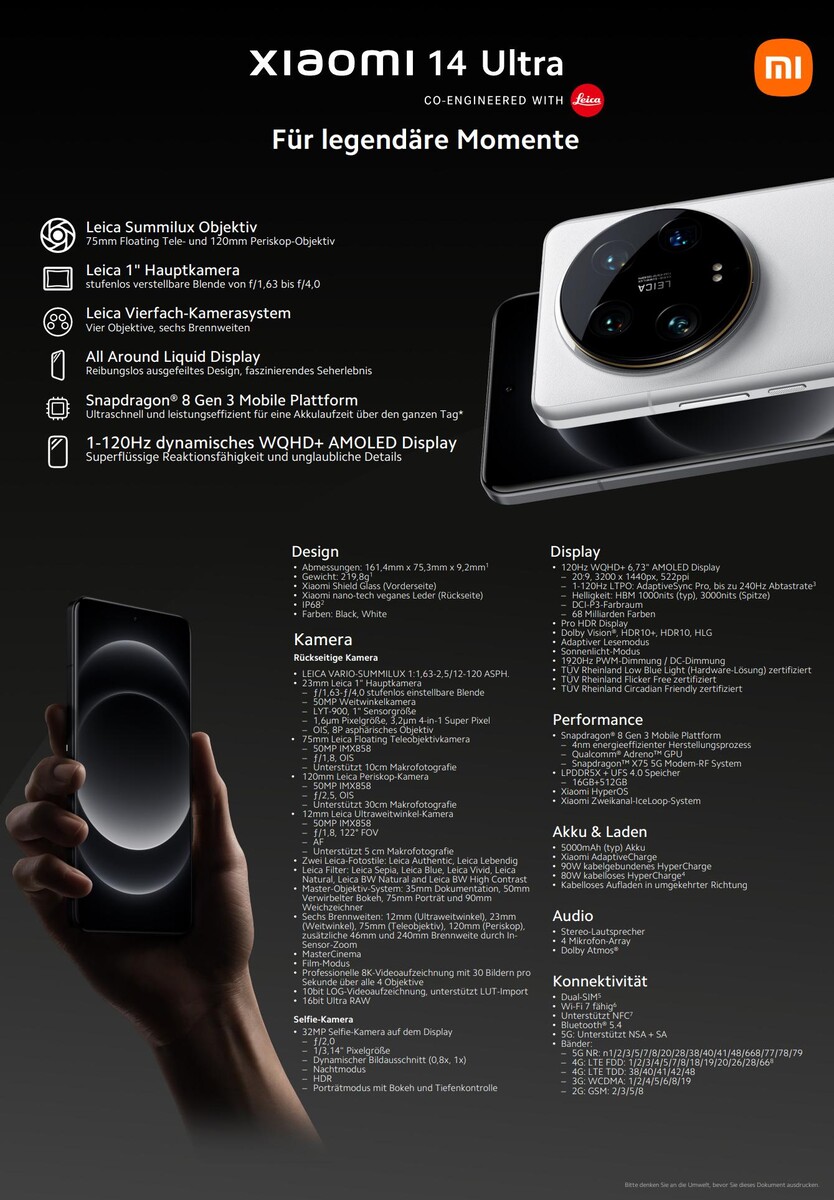 (Update) Dort ebenfalls nicht zu finden aber auf der Produktseite beworben wird die AISP Plattform, die bei der Kamera, etwa für Porträts und weitreichenden Zoom deutliche qualitative Verbesserungen bringen soll. (Update Ende) Auch was den Rest der Features betrifft, ist das globale Xiaomi 14 Ultra identisch mit dem China-Modell. Auf Basis des Snapdragon 8 Gen 3 bekommen Xiaomi 14 Ultra Interessenten ein schickes 6,73 Zoll AMOLED mit sehr dünnen Rändern im "All-Around-Liquid-Display" Design. Mit 3.200 x 1.440 Pixeln Auflösung, 1-120 Hz variabler Bildfrequenz sowie maximal 3.000 nits Peak-Helligkeit, 12-bit-Farbtiefe sowie Dolby Vision und HDR 10+ überzeugte es schon im global nicht erhältlichen Xiaomi 14 Pro.