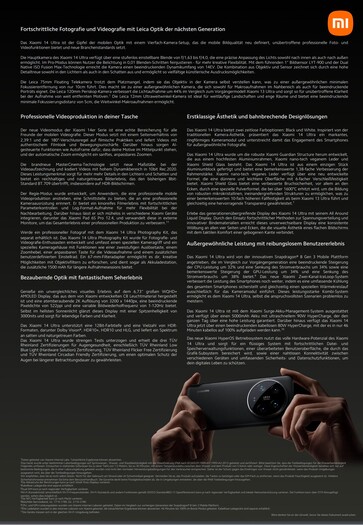 Wie schon beim China-Modell wirbt Xiaomi mit einem robusterem Aluminium-Rahmen, der schmutzresistenteren Rückseite aus "Nano-Tech-Veganem-Leder" sowie dem Xiaomi Shield Glas, das bei Stürzen noch bruchfester sein soll. Wie beim regulären Xiaomi 14 gibt es 4 Jahre HyperOS Updates und ein fünftes Jahr Sicherheitsupdates sowie 3 Monate Youtube Premium und 6 Monate 100 GB Google Cloud Speicher extra.