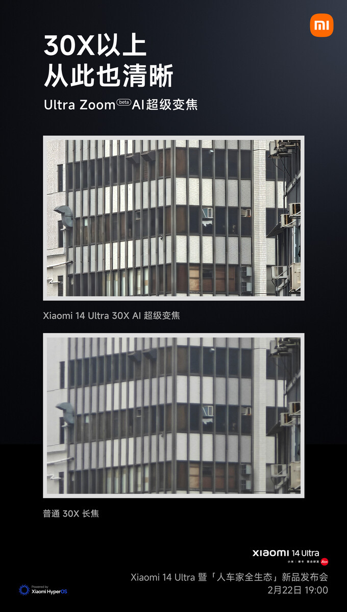 In den maschinell übersetzten Teasern bezeichnet Xiaomi AISP als die erste Large Model basierte Computational-Photography-Plattform, die bis zu 60 TOPs Leistung liefern soll. Vier konkrete Modelle nennt Xiaomi bereits: FusionLM, ToneLM, ColorLM sowie PortraitLM. Das ganze klingt etwas abstrakt, einen konkreten Vorteil demonstriert Xiaomi aber bereits mit dem Vergleichsbild unten, das einen 30x Zoomshot mit und ohne AISP-Unterstützung zeigen soll. Der mit AI-Power optimierte ist natürlich deutlich schärfer und zeigt mehr Details, konkret wird das Feature offenbar als "Ultra Zoom" bezeichnet und ist aktuell noch in Beta.
