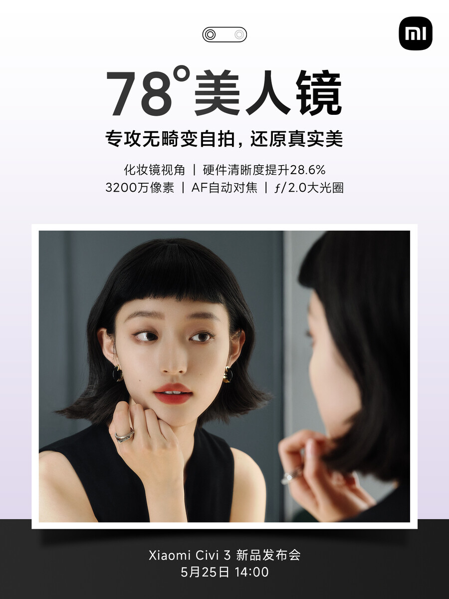 Insbesondere für Selfie-Fans und Vlogger will Xiaomi den neuen Handy-Schönling optimieren, wie die aktuellen Teaser nahelegen. So soll die 78 Grad FOV 32 Megapixel Selfie-Cam unverzerrte Selbstporträts erstellen, die dank KI-unterstützter Algorithmen, unterschiedlichen Soft-Light-Effekten und der zweiten 32 MP Kamera mit 100 Grad FOV besonders gut aussehen sollen. Mit 173,5 Gramm sowie 71,7 mm Höhe und 7,56 mm Dicke ist das Civi 3 aka Xiaomi 14 Lite zudem leicht, dünn und relativ schmal, verraten weitere Teaser. Das neue Dual-Tone-Design und die 50 Megapixel-Hauptkamera mit OIS wurde bereits gestern angeteasert, wobei die Vorderseite in den neuen Bildern nun doch nicht ganz so randlos wirkt wie im Teaservideo gestern.