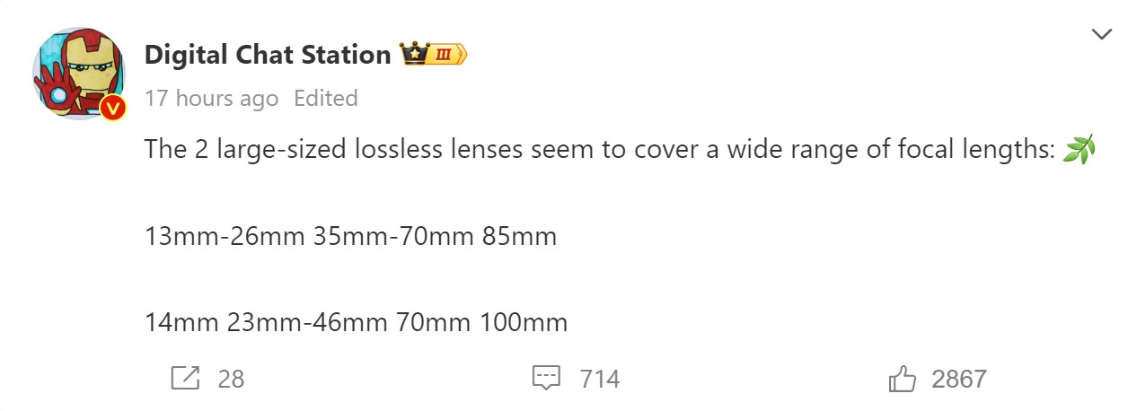 Der in China sehr geschätzte Leaker Digital Chat Station hat seine früheren Hinweise zur neuen Zeiss-Triple-Cam des Vivo X200 Ultra zuletzt um wichtige Angaben zu den äquivalenten Brennweiten ergänzt (siehe auch Screenshot unten). Demnach wird das auf dem 1/1.28 Zoll großen LYT-818 basierende Ultraweitwinkel mit 13 mm ein sehr breites Sichtfeld bieten, die bei Hauptkameras üblichen 23 bis 24 mm werden gar nicht direkt verfügbar sein, stattdessen werden 26 mm über Crop-Zoom mit der Ultraweitwinkel-Kamera abgedeckt.