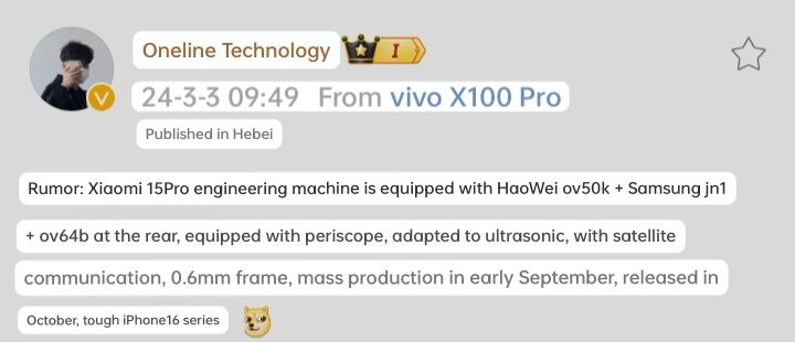 So berichten Leaker (siehe auch Screenshots unten) unter anderem von einem Ultraschall-Fingerabdrucksensor aus chinesischer Produktion in der gesamten Serie, der den bisher optischen ablösen soll. Das Xiaomi 15 dürfte wieder ein flaches Display erhalten, beim aktuell in Entwicklung befindlichen Pro-Modell reduzieren sich die Displayränder weiter auf 0,6 mm. Das mittlere Flaggschiff könnte auch erstmals eine Periskop-Telefoto-Kamera bekommen, angeblich auf Basis eines 64 Megapixel Omnivision OV64B. Dazu gibt es laut Gerüchten einen 1-Zoll OV50K Hauptsensor und einen 50 Megapixel ISOCELL JN1 fürs Ultraweitwinkel.