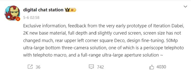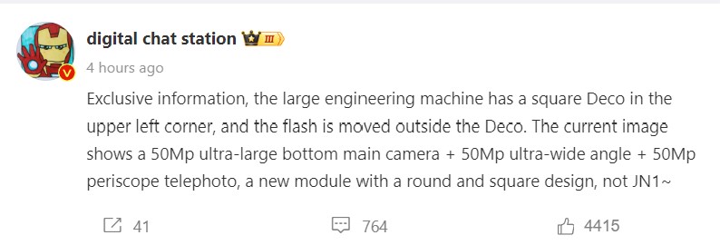Vom bekannten Leaker Digital Chat Station kam nun eine Art Bestätigung zu den Aussagen des Leakers Kartikey Singh in Bezug auf die Kameras des Xiaomi 15 Pro (siehe auch Screenshot unten). Demnach wandert der LED-Blitz raus aus dem quadratischen Kamera-Modul, neben der 50 Megapixel Hauptkamera mit großem Sensor und dem 50 Megapixel Ultraweitwinkel gibt es ein 50 Megapixel Periskop-Telefoto im neuen Design. Der ISOCELL JN1 Sensor ist Geschichte.