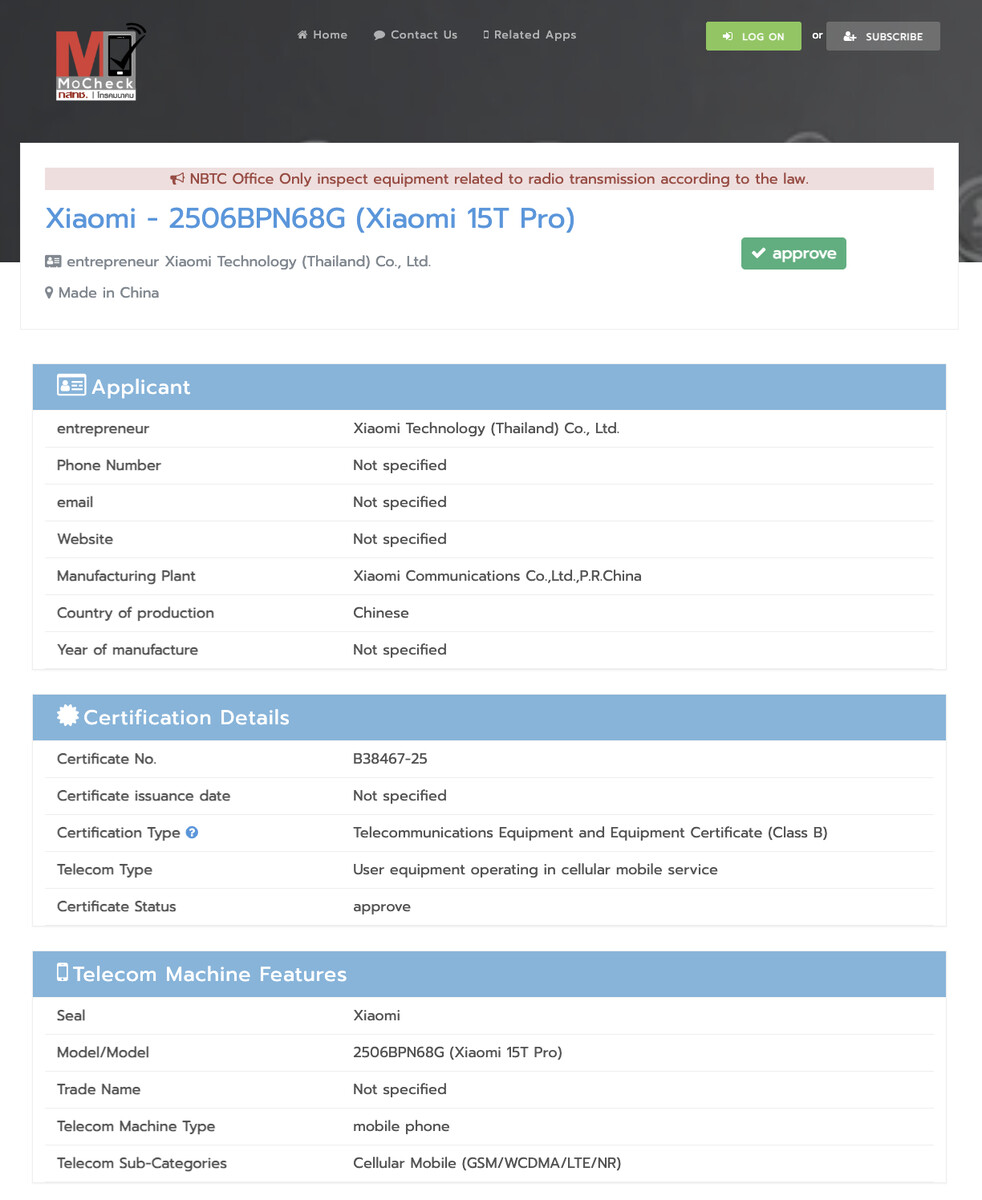 Im Gegensatz dazu hat die "National Broadcasting and Telecommunications Commission" (NBTC) den genauen Namen des Xiaomi-Smartphones nun offiziell veröffentlicht. Genauer gesagt gibt die NBTC an, dass es sich bei der Modellnummer 2506BPN68G um das Xiaomi 15T Pro handelt. Dementsprechend soll das Xiaomi 15T Pro in ein paar Monaten mit 256GB, 512GB und 1TB Massenspeicher erscheinen. Anders als beim Vorgänger soll der RAM aber auf 12GB limitiert sein, worüber wir zuvor bereits berichtet haben.