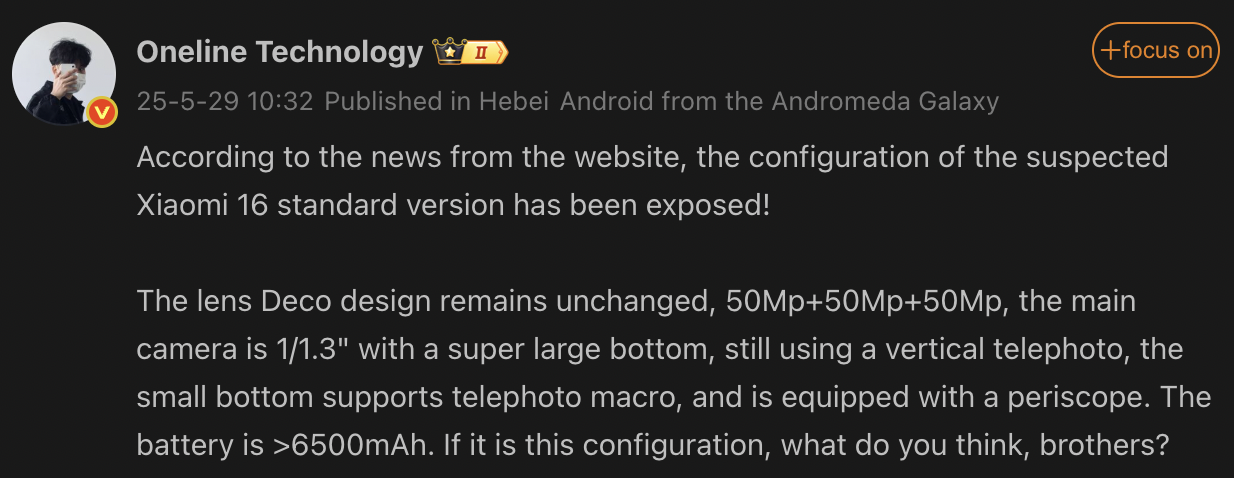 Dem Leak zufolge bleibt Xiaomi beim Xiaomi 16 dem Kameradesign des Vorgängers treu. Auch die Spezifikationen der Triple-Kamera sollen weitgehend unverändert bleiben: Erwartet werden ein 50-MP-Hauptsensor (1/1,3"), ein 50-MP-Ultraweitwinkelobjektiv und ein 50-MP-Teleobjektiv.