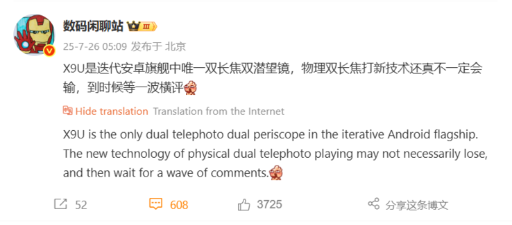 Ein weiterer Vorteil sei der Support für In-Sensor-Zoom (ISZ) womit auch die äquivalenten 35mm und 50mm Brennweiten in laut Leaker sehr hoher Qualität abgedeckt sein sollten. Zudem verbaut Vivo im Dimensity 9500 Flaggschiff offenbar ein 3x Periskop-Telefoto mit 1/2 Zoll Sensor und 3x Zoom, das höchstwahrscheinlich auch eine Telemacro-Funktion bieten soll. Im Kamera-Flaggschiff-Segment mit kompakter Display-Größe dürfte Vivo hier einen interessanten Kandidaten in Entwicklung haben - so der Leaker.