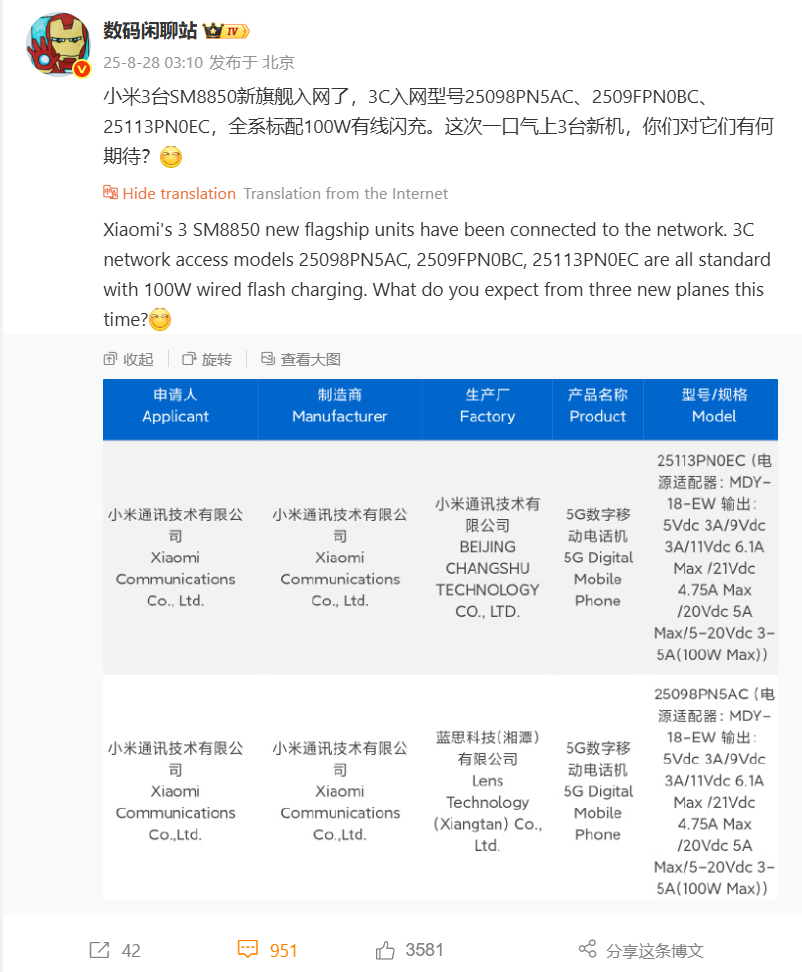 Nun wurde zumindest mal die Existenz von drei in Kürze startenden Xiaomi 16 Modellen durch die chinesische 3C-Zertifizierungsbehörde bestätigt. 25098PN5AC, 2509FPN0BC, 25113PN0EC lauten die Modellnummern der in China in wenigen Wochen erwarteten Kamera-Flaggschiffe, die überraschenderweise auch ein Fast-Charging-Upgrade bieten werden. Wie man aus dem von Digital Chat Station auf Weibo geposteten Screenshots (siehe auch unten) entnehmen kann, erhöht Xiaomi die maximale Ladegeschwindigkeit auf künftig maximal 100 Watt.